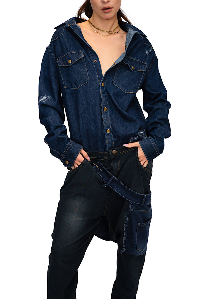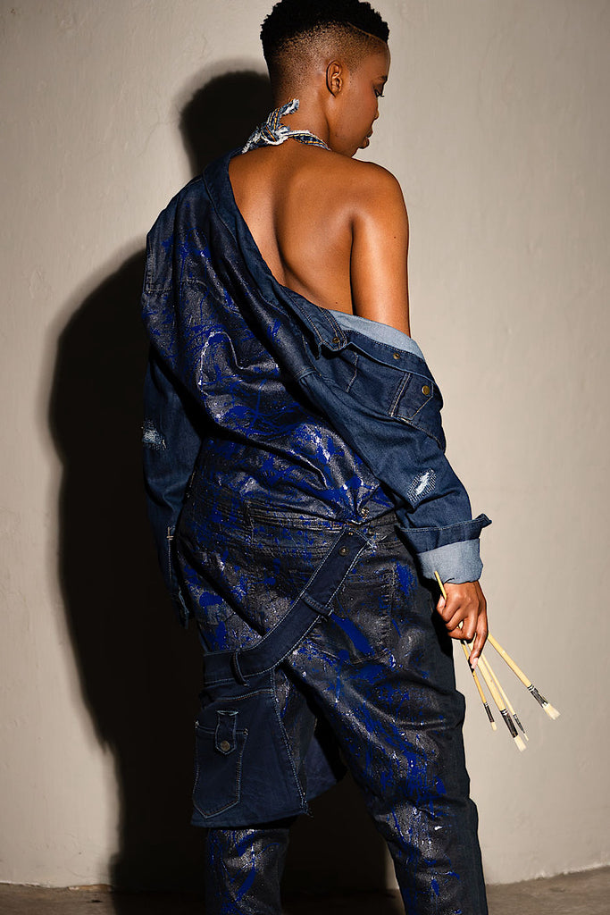 This jumpsuit features a front closure adorned with studs, adding a sleek metallic touch. It showcases a slight drop-crotch design, offering a modern and relaxed fit. Attached to the jumpsuit is a denim jean pocket bag, enhancing its artistic flair. The back is a standout element, fully splattered with blue metallic paint, turning the piece into a vivid, artistic expression. The overall design is both functional and creatively unique.