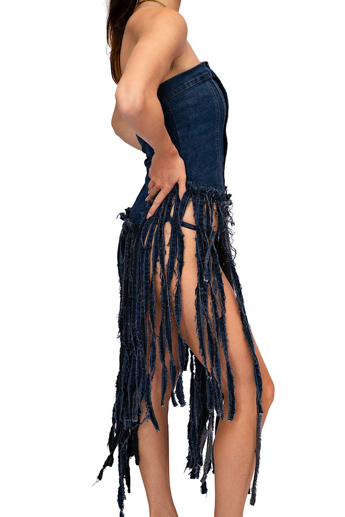 The design features a boob tube silhouette with front buttons for closure. The hemline is adorned with cut denim side seam strips, creating a playful tassel effect. Versatile and eye-catching, it can be worn on its own, layered over jeans, or as a chic beach cover-up. This unique piece is perfect for size small to medium and exudes elegance, sustainability, and originality.