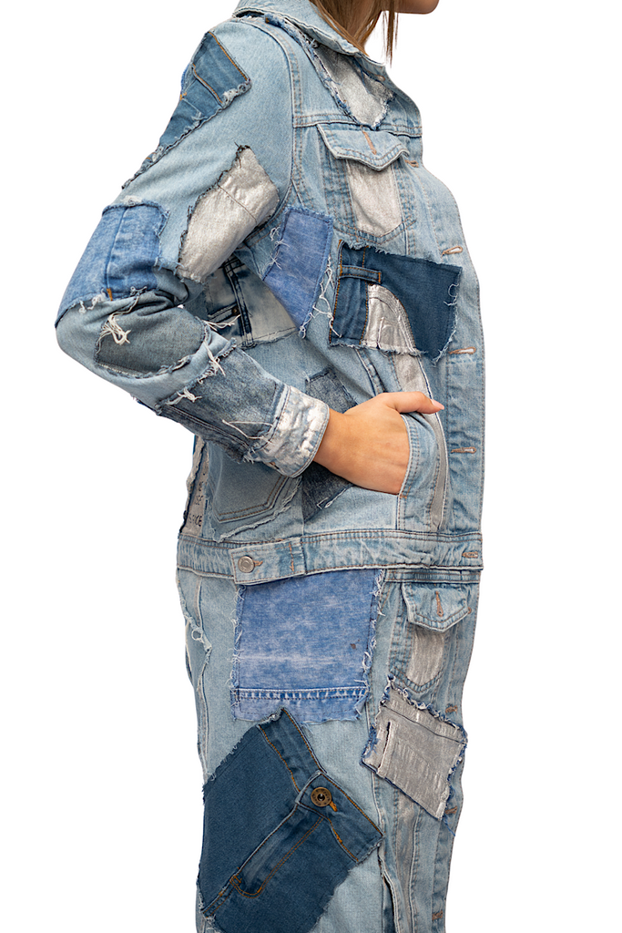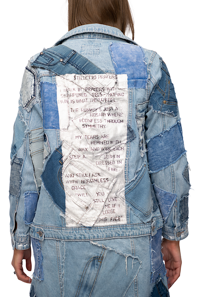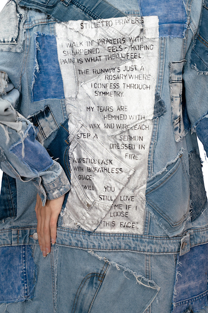 The Stilletto Prayes Jacket is a striking upcycled denim piece, expertly crafted from various patchwork denim fragments sewn together to create a long, layered jacket. Each patch adds a unique texture and character, giving the jacket a vibrant, eclectic appearance. The artist, Soochi, has painted an intricate poem titled "Stiletto Prayers" directly onto the back, adding an artistic, poetic dimension to the REVIVAL theme. This jacket embodies creativity and sustainable fashion, blending bold visual design with meaningful storytelling through its hand-painted poetry.