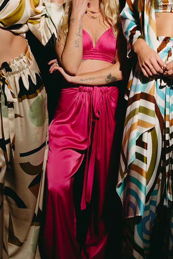 A soft, silky, lightweight top with long sleeves and a beautiful drape. This top can be styled in any which way you choose - wear it open as a kaftan or tie it as a wrap top. This item pairs perfectly with any colour and item of the Bahama’s range. This includes a luxurious pair of pants, a elasticated adjustable bra and a halter neck dress available in a variety of colour ways.