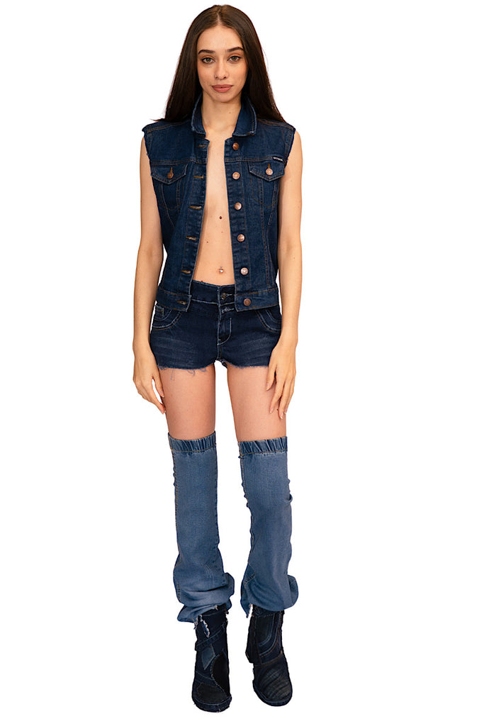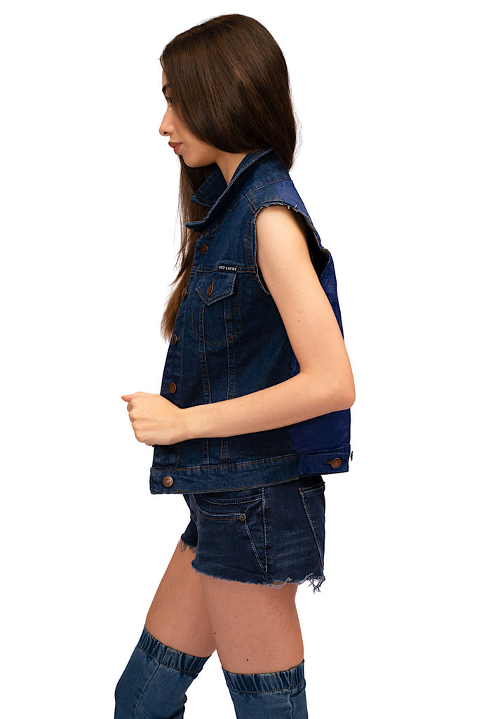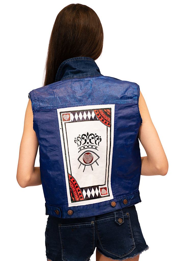 This is a stylish, cut-off denim jacket with a unique and artistic design. The front of the jacket is plain denim, secured with buttons for closure. The back features an eye-catching, large painted or embroidered patch that resembles a playing card, specifically "The Joker.”